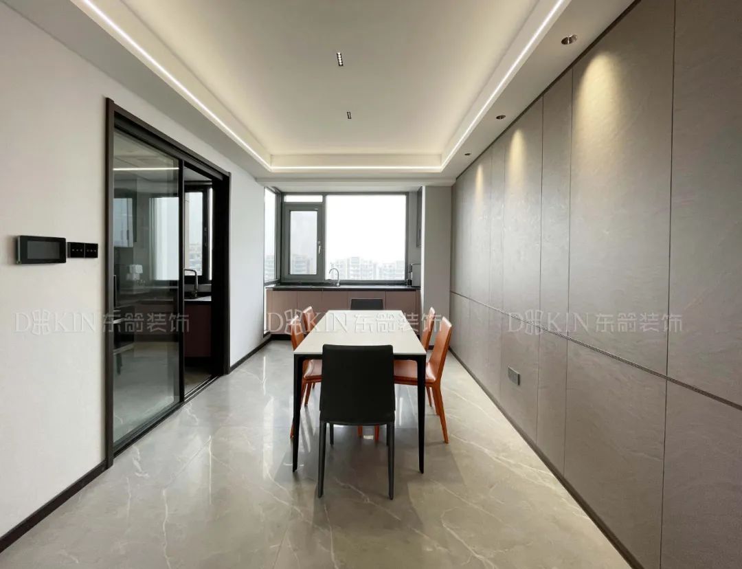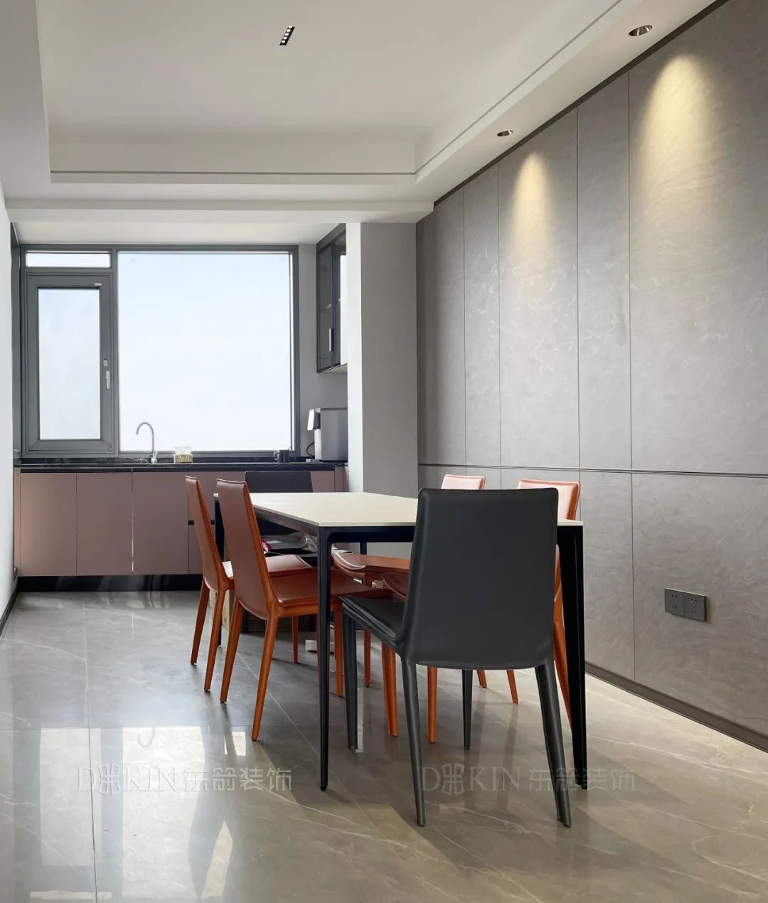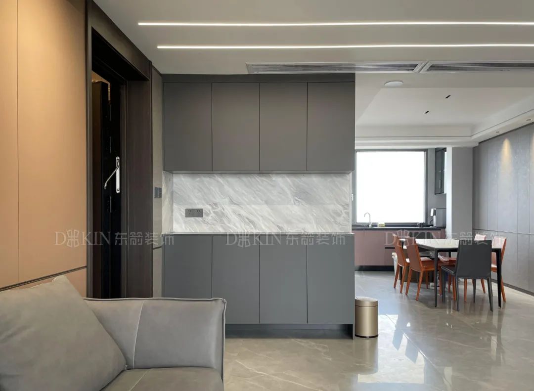 餐廳空間保持自然質(zhì)感采用了黑白灰風(fēng)格,水吧臺增添實用性和休閑設(shè)計感,讓家里變得溫馨起來。