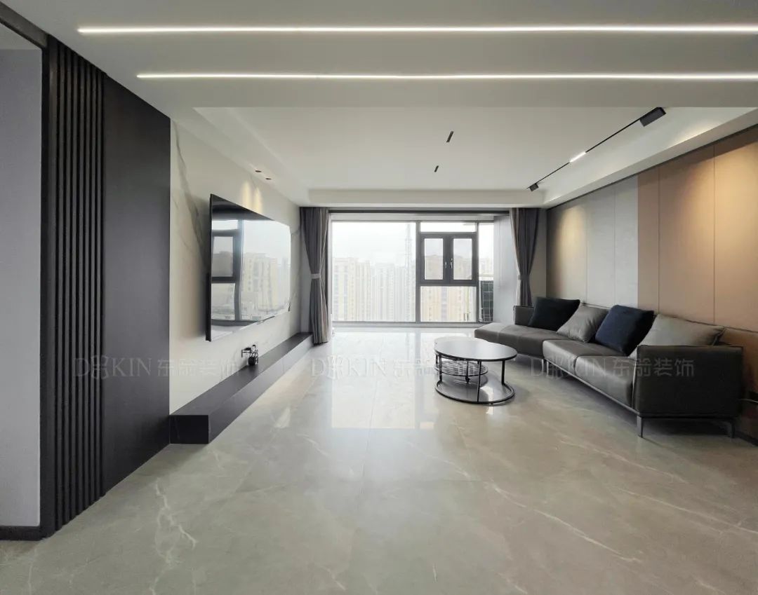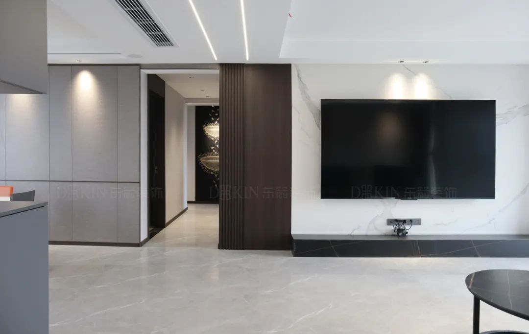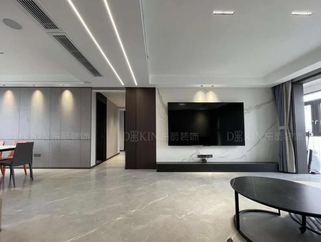 4.客廳采用的是巖板、木飾面、壁臺設(shè)計,無主燈搭配線條燈帶。