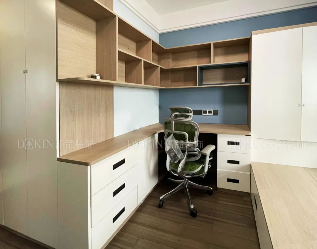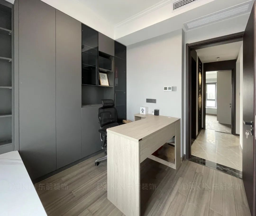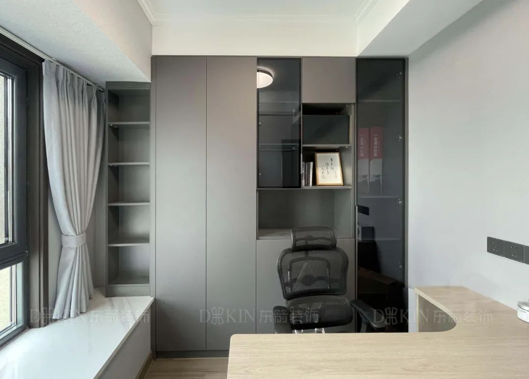 定制書桌和書柜滿足辦公和閱讀需求,灰色搭配也增加了空間設(shè)計感和實用性。
